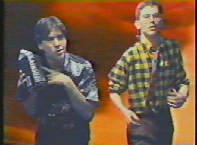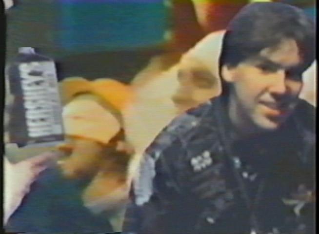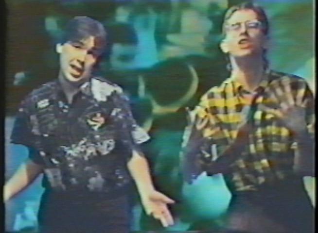 During the height of Bovine Ignition Systems, Jeremy and I got into various ideas for video projects and perhaps shooting a music video of some sort. After all, it was 1987 and MTV ruled the planet. Any self-respecting band needed a video. But how would we afford one? The answer came when we found a "shoot your own video" place had opened up at the Galleria mall in White Plains. This was a straight Impulse Buy kind of operation, obviously intended for the locals to record themselves singing over some stilted Huey Lewis and the News or Madonna tracks, then video record themselves singing while sunsets showed in the backgrounds. But Jeremy and I saw it another way: an entirely cheap and easy way to record our big music video breakthrough.We talked with the guys running the video place and asked if we could provide our own music; they said sure. We asked if we could provide the videotape for the background images; they said sure. We asked what the length of a video could be; they said up to six minutes. And how much would this all cost us? $50.