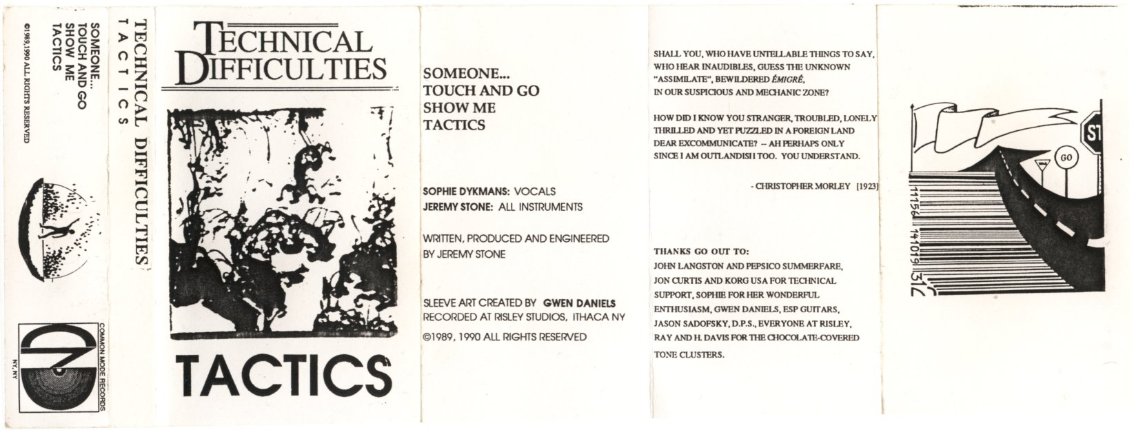 While esconsed at Risley House during his college years, Jeremy had access to an eight-track recording studio. While further BIS work was done as what became "The Bovine Polka", Jeremy took this opportunity to do work as another band, called "Technical Difficulties" where he brought in the vocal abilities of one Sophie Dymans and created what Jason calls "80's style Bryan Adams Rock" and what Jeremy called "Hey, Shut Up, Jason". The result was a four-song demo tape called "Tactics". The full cassette insert can be seen by clicking on the image, and the four songs can be heard below (MP3, 192khz). Some of the songs had existed in one form or another during the BIS heyday, although they hadn't reached this level of maturity.