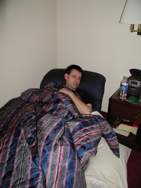 | sleepsnuh.jpg | 123035 | Snuh makes the important discovery that ou can in fact sleep overnight in a Laz-E-Boy chair. Candlewood Suites. |